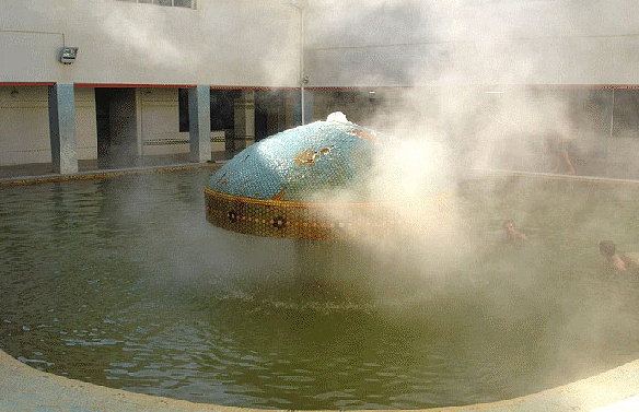 هر چند فعالیت مراکز آب گرم این شهر به پیش از انقلاب اسلامی باز می گردد اما هم اکنون در ضلع جنوبی هتل پارسیان شامل ۲۴ وان خصوصی جداگانه برای آقایان و بانوان، یک استخر خصوصی، خزینه عمومی مشترک برای استفاده آقایان و بانوان در ۲ شیفت کاری، پارکینگ، فروشگاه غذایی و سه باب آلاچیق است که آب آن از ۲۰ رشته چشمه که به چشمه های گوگردی گازدار معروف است، تامین می شود.